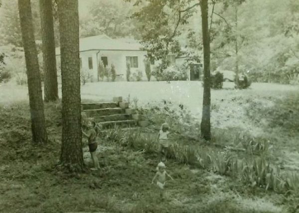 The really funny thing was that we remembered the park with more certainty than we remembered the front of our home– neither Carla nor I could be sure which of two different houses across the street had been our own. Later we went back to Mama and Daddy’s last home in Fayetteville, where our younger brother now lives. He wasn’t even born during those years, but he pointed us to the old photos where we located the picture posted above. There was no doubt now which house had been ours, and it has held up well during the nearly 60 years since the first photo was taken: