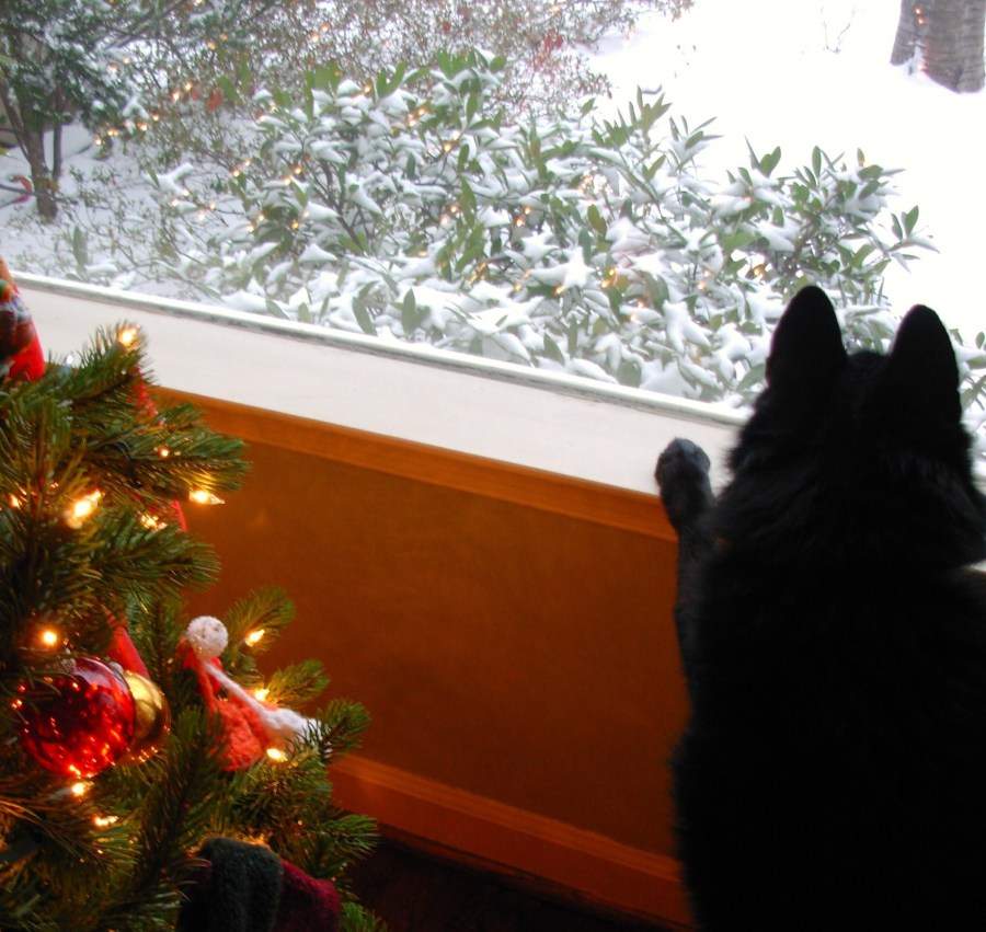 Pasha watches the snow fall at Christmas time