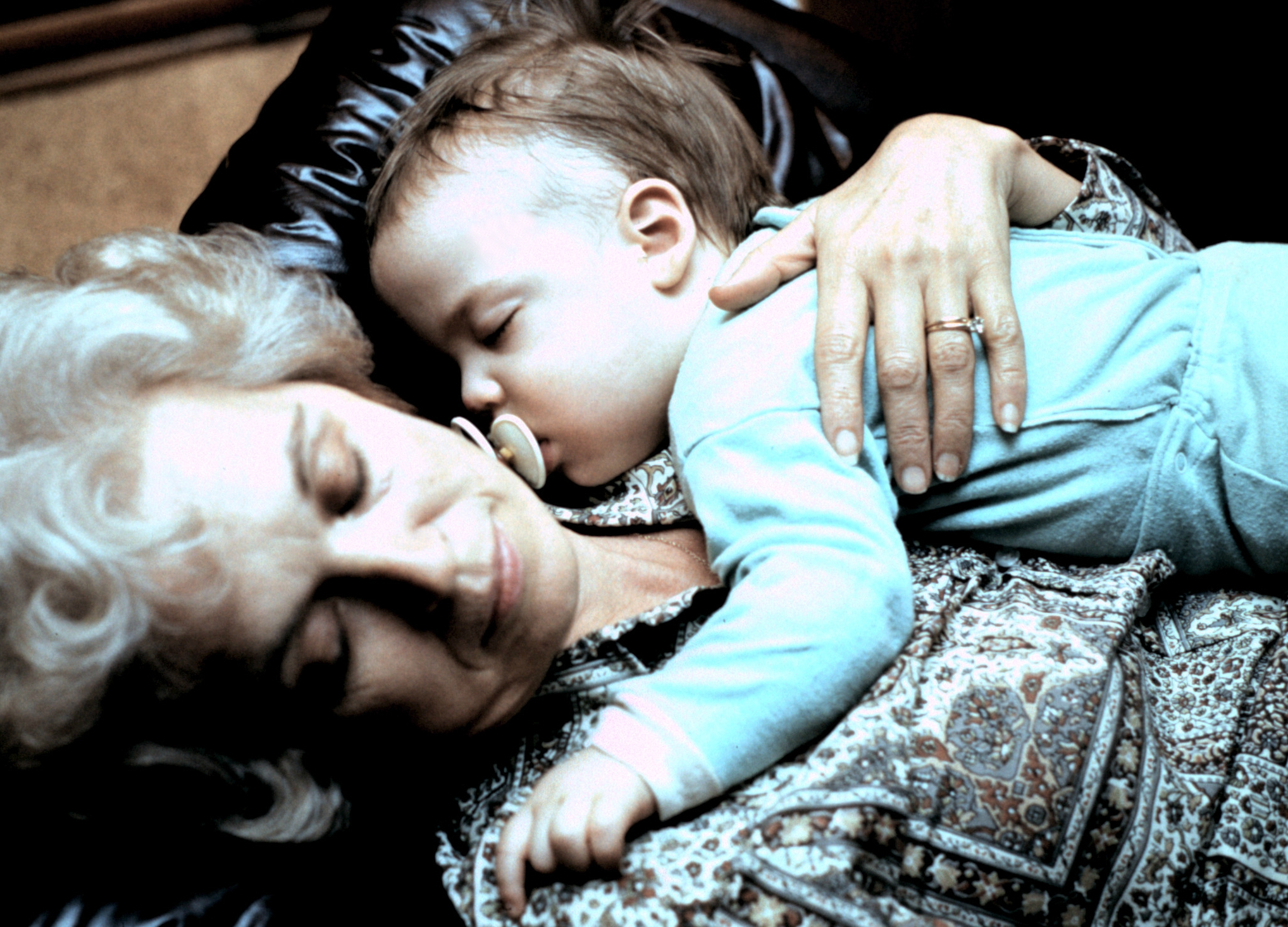 Sleeping like a baby: Mama naps with her first grandchild, Ryan, in 1976