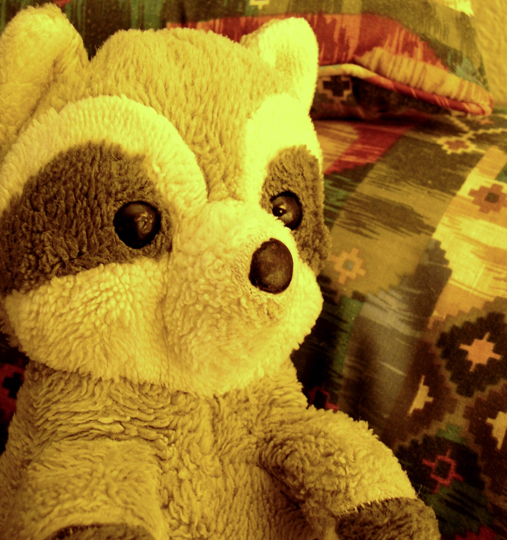 Does this raggedy raccoon look familiar?  If so, you may have seen him in this post.  Actually, I have pictures of him in any number of places; looking out the window of the Coast Starlight, cruising the Caribbean, catching the rays of Hawaiian sunshine.  He’s a world traveler, and though he never talks about his experiences, they have clearly left their mark on him.