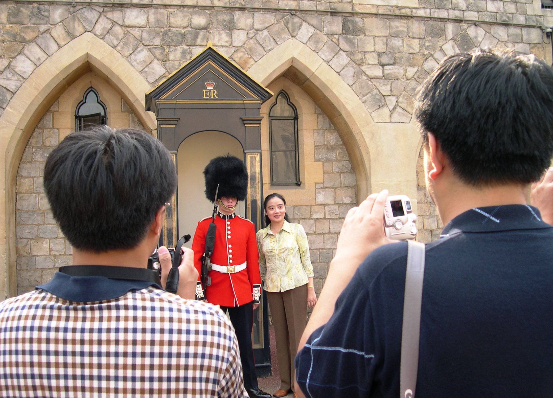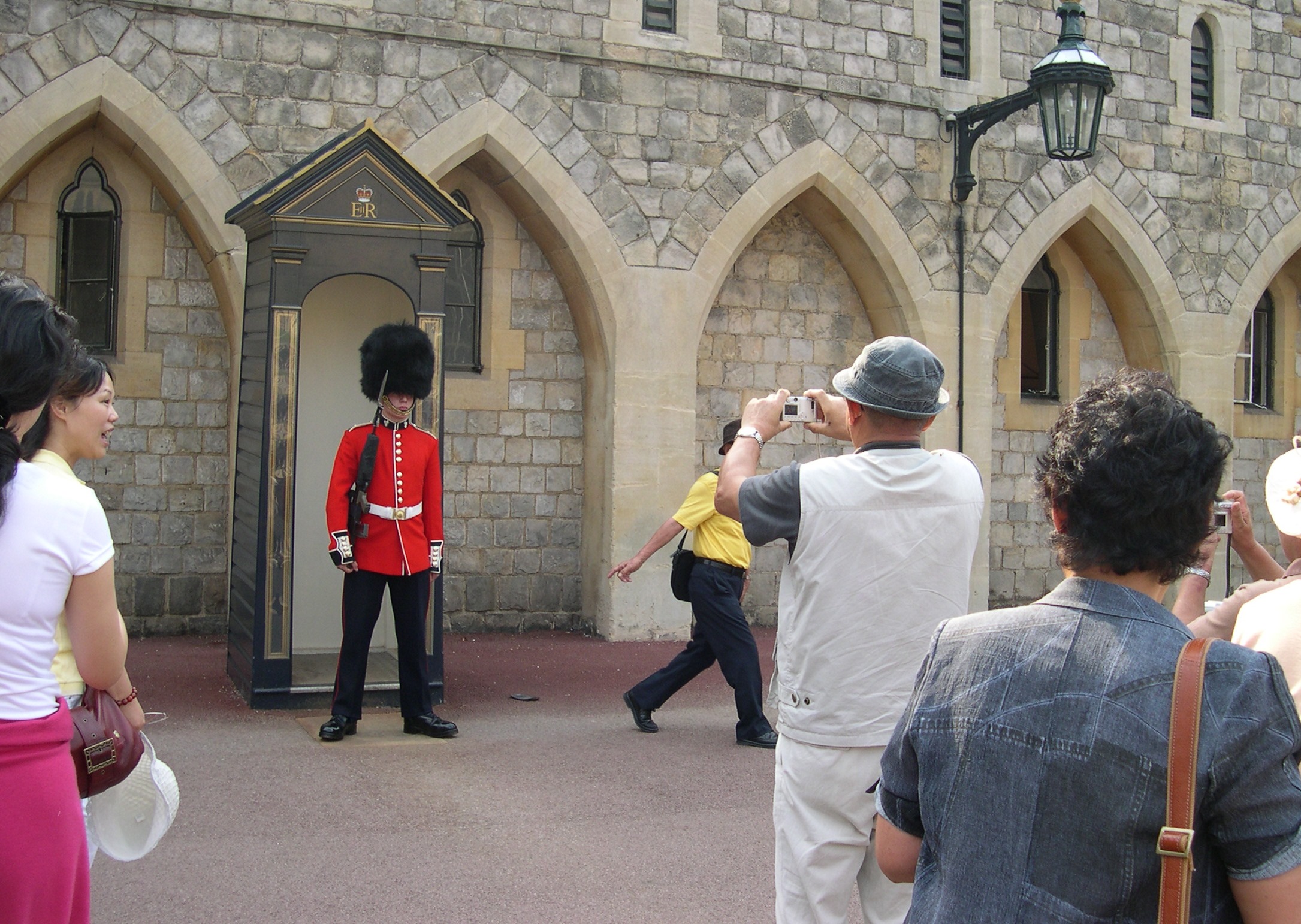 One of many tourists who pose with the Queen’s Guard. Windsor Castle, August 2005