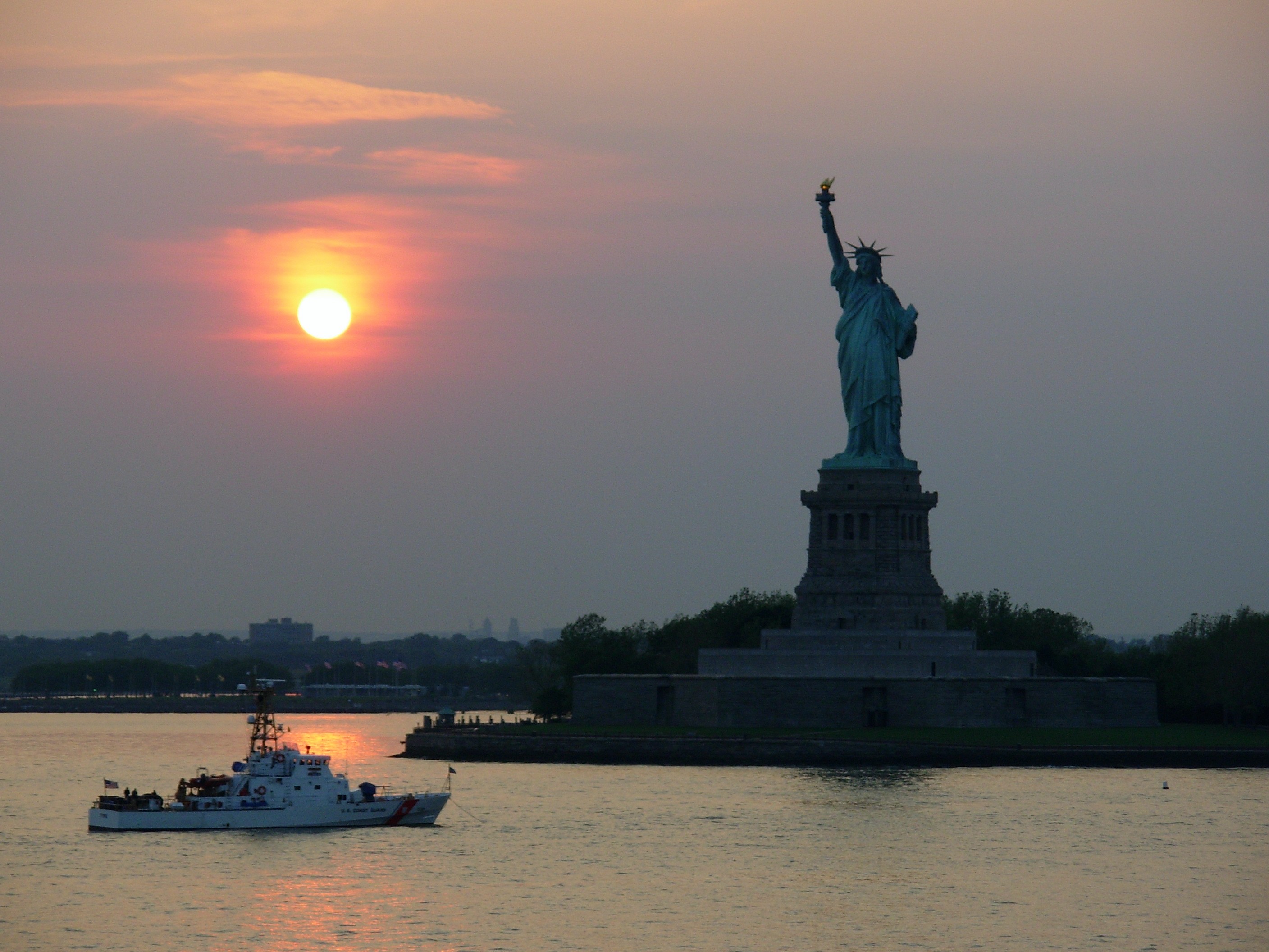 In this photo, clouds cause the setting sun to provide only dim illumination of Lady Liberty. Therefore it only seems appropriate that the sun’s reflection off the water is not past the bow of a passenger liner, bringing emigrants; but instead reflects the pall of September 11, 2001 by silhouetting a Coast Guard vessel, complete with deck gun. (That’s what I see.)