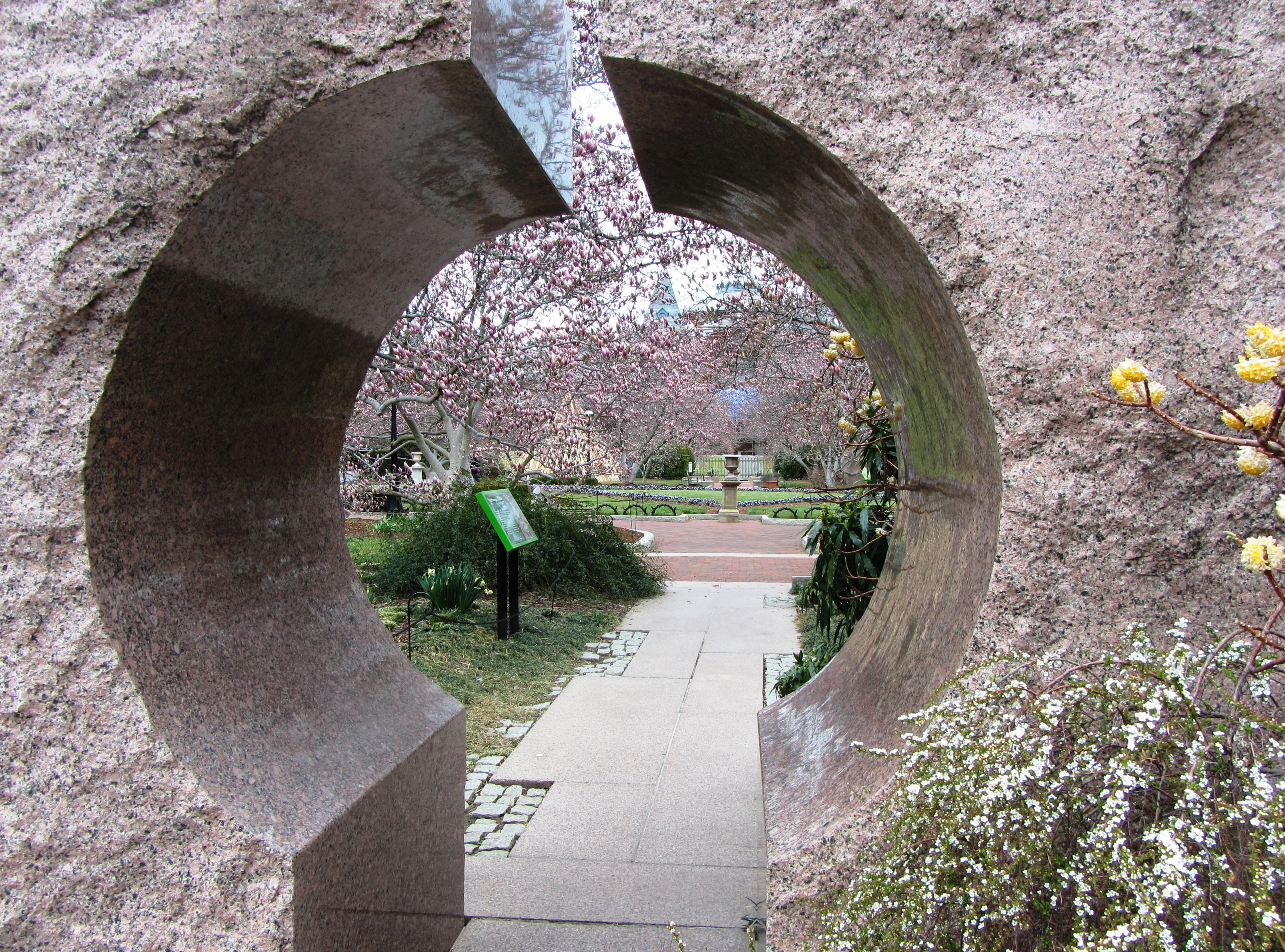 Hi Carol, thanks for your visit and question. The photo was taken at the Moongate Garden, which is pictured and discussed at the right margin of this linked page (scroll down and keep looking to the right until you get to Moongate Garden). You probably will be able to recognize the aerial view of the gate pictured. The home page at that link has some excellent visitor info about the Smithsonian’s many lovely gardens, which are often overlooked in the shadows of the more famous museums in their midst. I hope you have a wonderful trip!