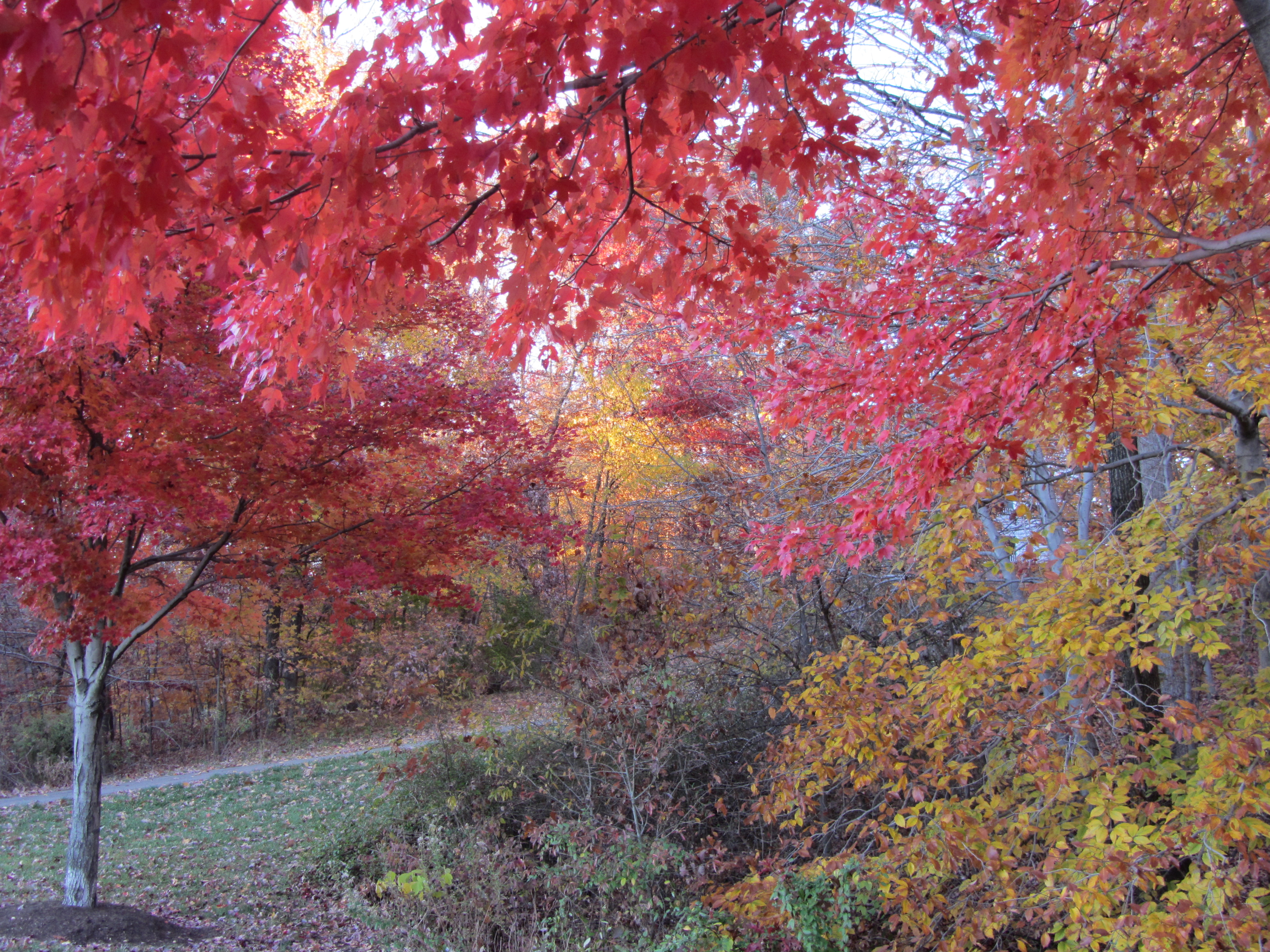On the way home, Jeff and I talked of how stunning the trees looked, despite many of them having lost their leaves. He decided to take Matt to the gym while they still both felt able to go, and I took my walk while they were there, enjoying the perfect weather and breathtaking autumn beauty. The sun was lighting up the colors to almost electric levels. I took my camera so I could bring you along with me on my walk. All these photos were taken within a mile of my home, along my usual routes for daily 2-mile walks. None have been digitally enhanced to improve the color (partly because I don’t have time to fool with photo editing tonight).