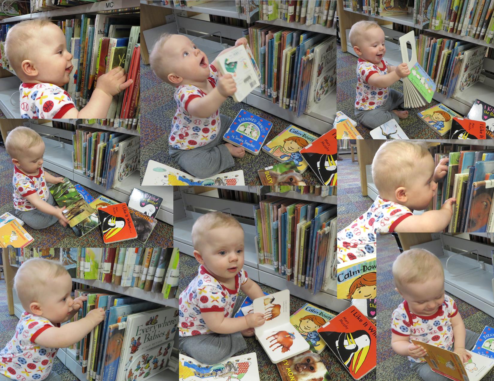 “So why on earth would you take an eight-month-old baby to a library?” my mother asked me, when I told her how Matt and I had spent the previous day with Grady. As a retired librarian who specialized in youth services, I just smiled and offered her the photographic evidence, some of which appears in the collage above. My mother understood immediately.