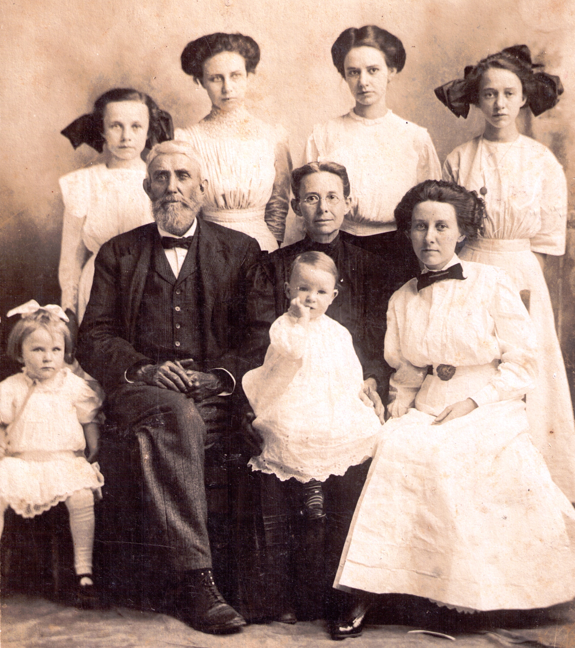 Lena, standing between Henrietta and Granny in the back row, is the only one of Granny’s sisters that I remember well. She lived with Granny after they were both widows, and as kids we were entertained by her parakeet “Pretty Bird,” and by her conversations with Granny and us about the family’s past. She too lived a long and healthy life, and she was my special favorite, crocheting me the proverbial wrap of many colors, and spending long hours chatting with me.