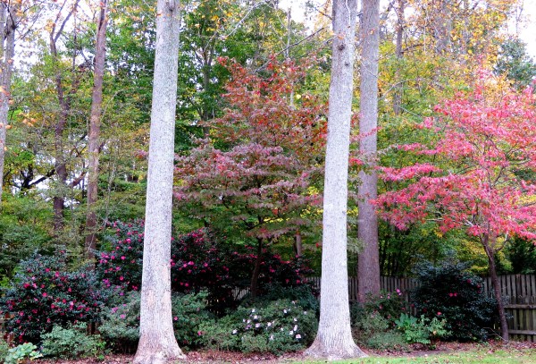 I wrote awhile back how this part of our yard had managed to keep blooming despite years of benign neglect. Not long ago I finally made the time to get outside and do some serious pruning to clear out some of the overgrown areas. Just yesterday, I took a photo of our camellias in bloom, along with a few lingering flowers from our fall-blooming azaleas, and the dogwood foliage beginning to show its autumn crimson. Some of our azaleas bloom three times per year (spring, summer and fall) but it’s the camellias that really dazzle in the fall and winter. We liked them so much that we had some planted in the front yard too. Here’s a closeup of the ones in the first photo, in the back yard.