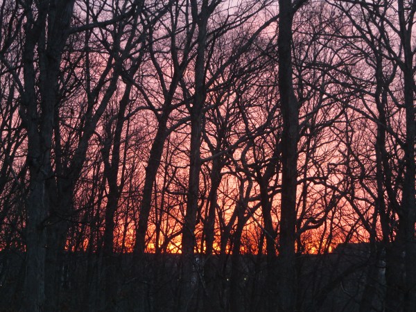 I bought the lot on which my current home was built because it had trees on three sides. I take a lot of fabulous sunrise photos out the east-facing windows of my home, toward the Potomac River. But the back windows have glorious views of blooming trees in spring, bright flowers in summer, and dazzling foliage in the autumn. Winter? Not as spectacular most times of the day. But those sunrise colors are stunning in that direction, too, with the bare trees in dramatic silhouette.