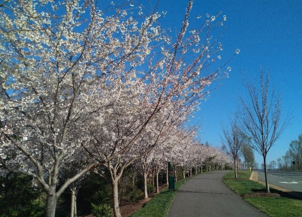 Good morning, Julia! What a pretty sight those flowing trees are! What sort of trees are on the street-side of the sidewalk? It looks like they bloom a little later? Yesterday was unseasonably warm here and I took my cat out to play in the yard. He had specific spots around the yard that he likes to check for new smells, so we take a pretty thorough tour of the yard. Several of the small trees that i planted last year had been cleaned of all branches by the deer and other animals that forage during the winter, but others were somehow overlooked (a red pine and one cedar) and still had their foliage. The Japanese maple i planted last year lost all of it’s branch tips, so we will have to see if it survives. Everything needs water, but we’re expecting almost an inch of rain today.