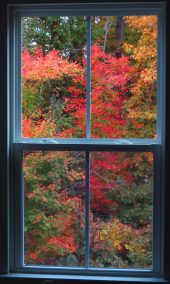 Just as I hoped, there are some vivid shades surrounding our home, including the bright red leaves I so love to see in the landscape. If you never tire of seeing photos of autumn foliage, scroll on to see views from various windows. But if you have a “seen-one-seen-them-all” boredom with too many similar photos, you might want to exit now. Consider yourself warned! I can almost hear Jeff saying “Julia, how many photos of leaves do you think they want to see?”