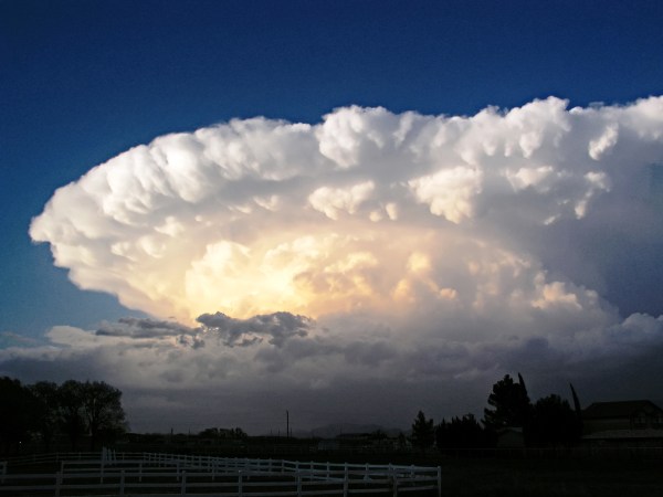 On April 3, 2004, this supercell thunderstorm dropped 2″ diameter hail over Chaparral, N.M. causing widespread damage. Even so, the sun broke through those formidable clouds.